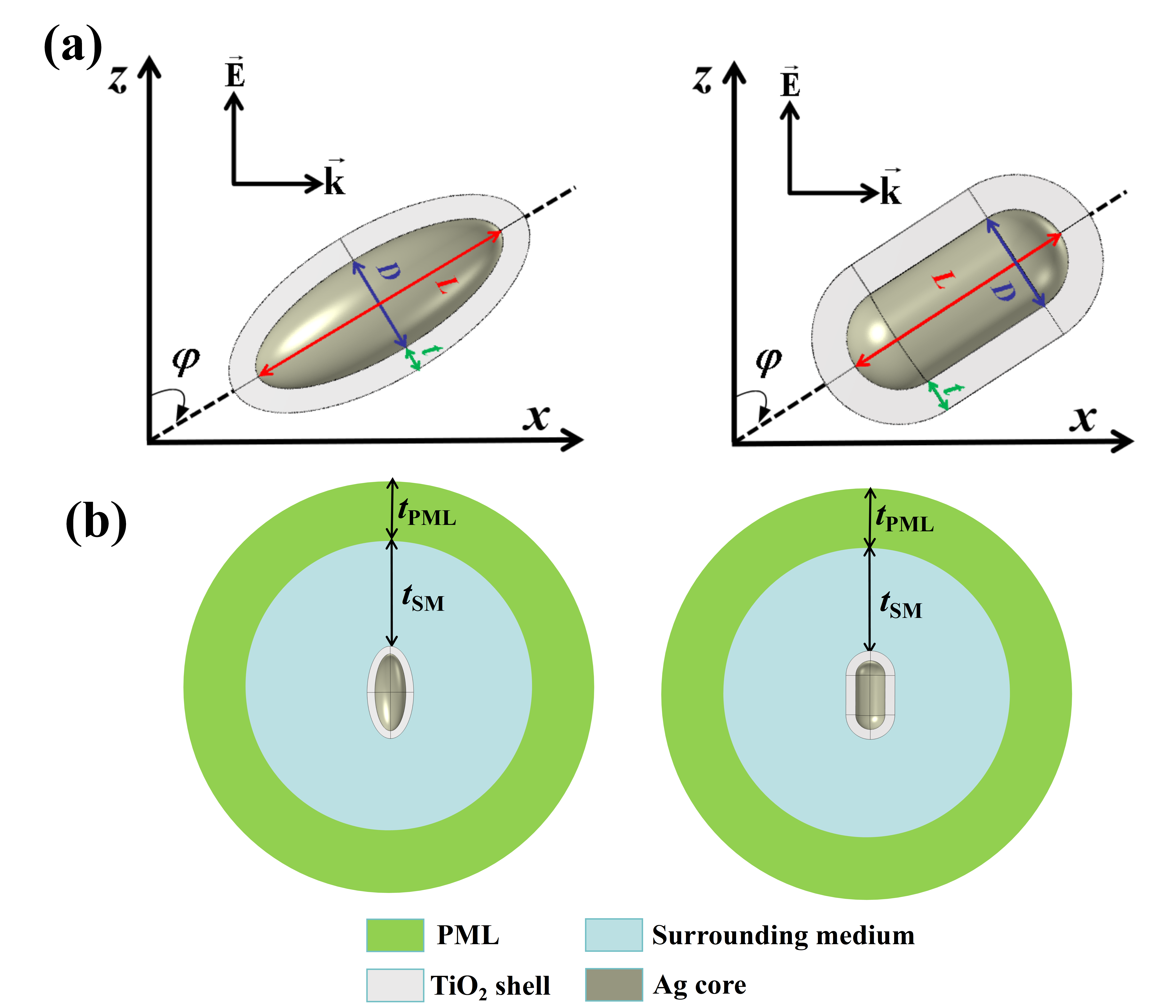 图1 Ag@TiO2核壳纳米颗粒的(a)几何模型和(b)FEM仿真区域示意图