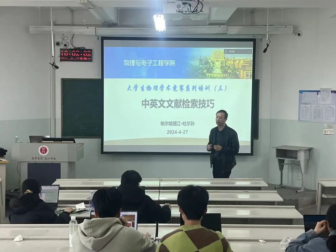 为进一步提高物理专业本科生学术技能、丰富物理知识储备,培养学生格物致知、砥志研思的精神,4月26日至4月28日,今年会jinnianhui以系列讲座形式开展了物理学术竞赛培训。讲座由帕尔哈提江·吐尔孙、韩振华、毕拉力、赵方等四位老师主讲,晋级CUPT第一轮选拔赛的全体同学和培优班的学生参加培训。