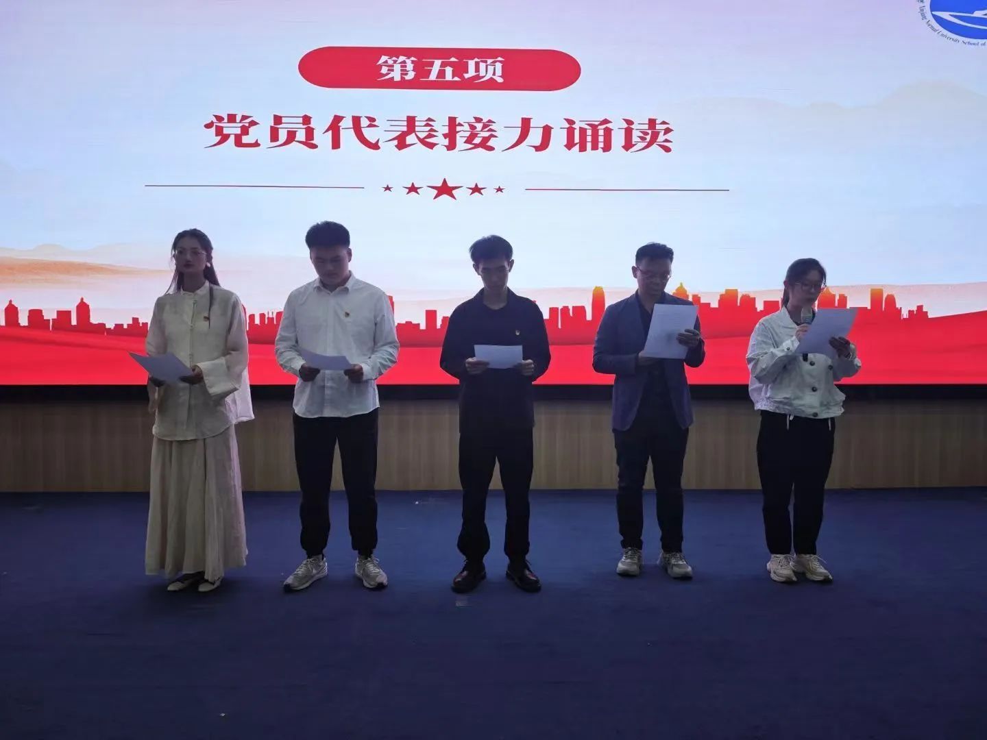 活动伊始,学院党委副书记、纪委书记买星同志领学《习近平在文化传承发展座谈会上的讲话》,并围绕“严守八项规定,弘扬清廉端午”讲授专题党课。随后,副院长帕尔哈提江·吐尔孙同志主持新党员入党仪式,老党员为6名新发展党员佩戴党员徽章,全体党员重温入党誓词,铿锵誓言响彻会场,激荡着初心使命的力量,“严守纪律”的承诺格外坚定。为深化作风建设,活动中,师生党员还接力诵读了《中央八项规定精神实施细则》《习近平关于加强党的作风建设论述摘编》等内容,以“原原本本学”推动“实实在在做”,让纪律意识入脑入心。新党员代表李艽(师生联合党支部)、王俊鹏(本科生第一党支部)先后发言:“八项规定不是‘紧箍咒’,而是党员的‘护身符’,端午的粽子不仅是美食,更应成为‘清廉’的象征,粽叶裹住规矩,糯米夯实作风,“从‘折纸龙舟’到‘入党宣誓’,今天的活动让我更深刻理解了‘师生同心’的意义——我们青年党员要像龙舟桨手一样,与老师同频共振,为学院发展、为民族复兴贡献青春!”