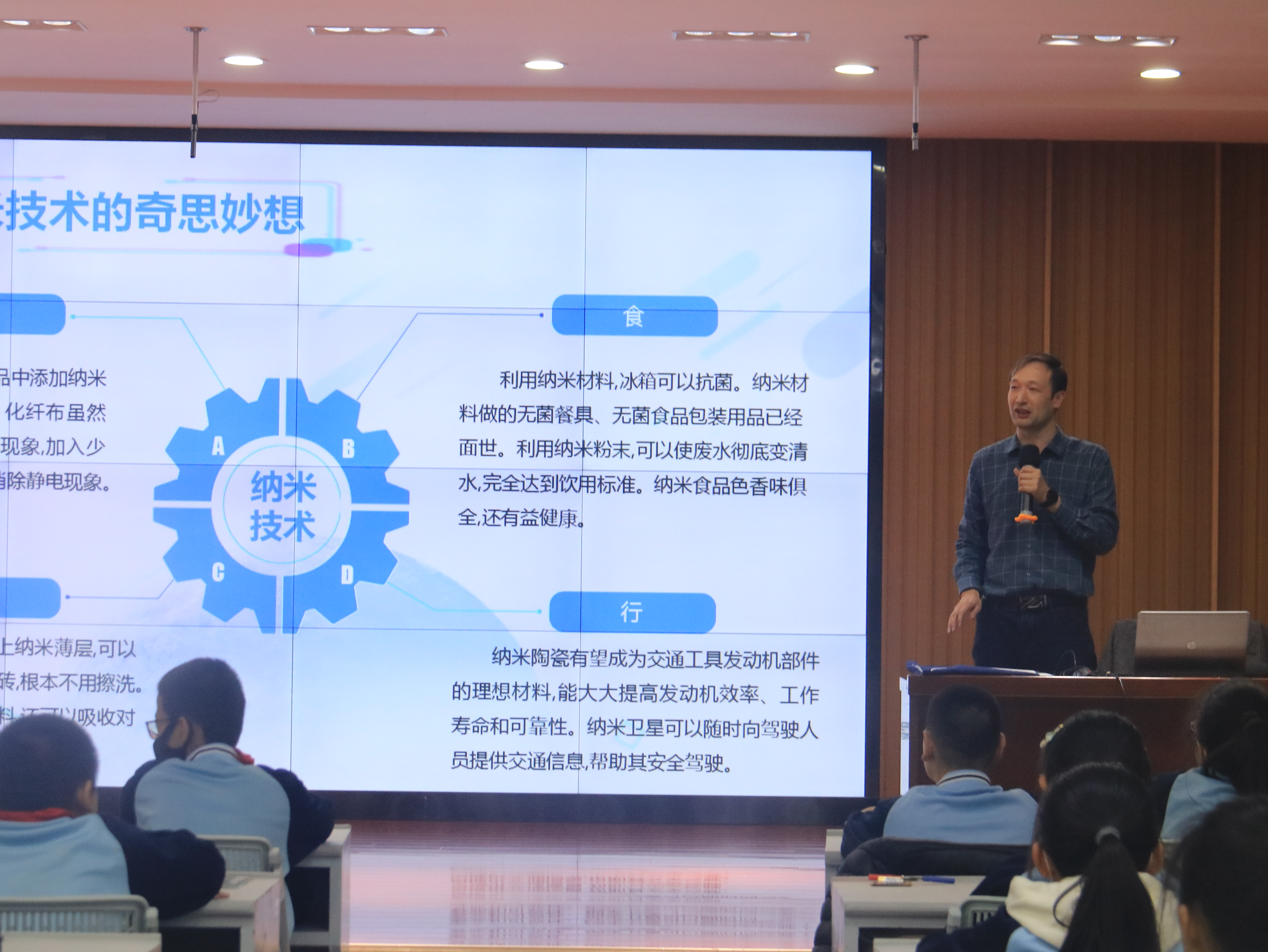 作为“三人行·融合行”党建品牌创建内容之一,今年会jinnianhui物理系主任帕尔哈提江•吐尔孙教授面向六年级学生开展了“纳米奇幻演绎:微触世界的未来之旅”专题讲座。他生动形象给孩子们讲解了纳米技术的含义以及生活中纳米技术的应用,孩子们积极参与并回答自己关于纳米技术的理解,并对未来的纳米技术提出了自己的设想。帕尔哈提江•吐尔孙老师对孩子们提出了期许,希望他们好好学习,将来成为科学家,为国家做贡献。