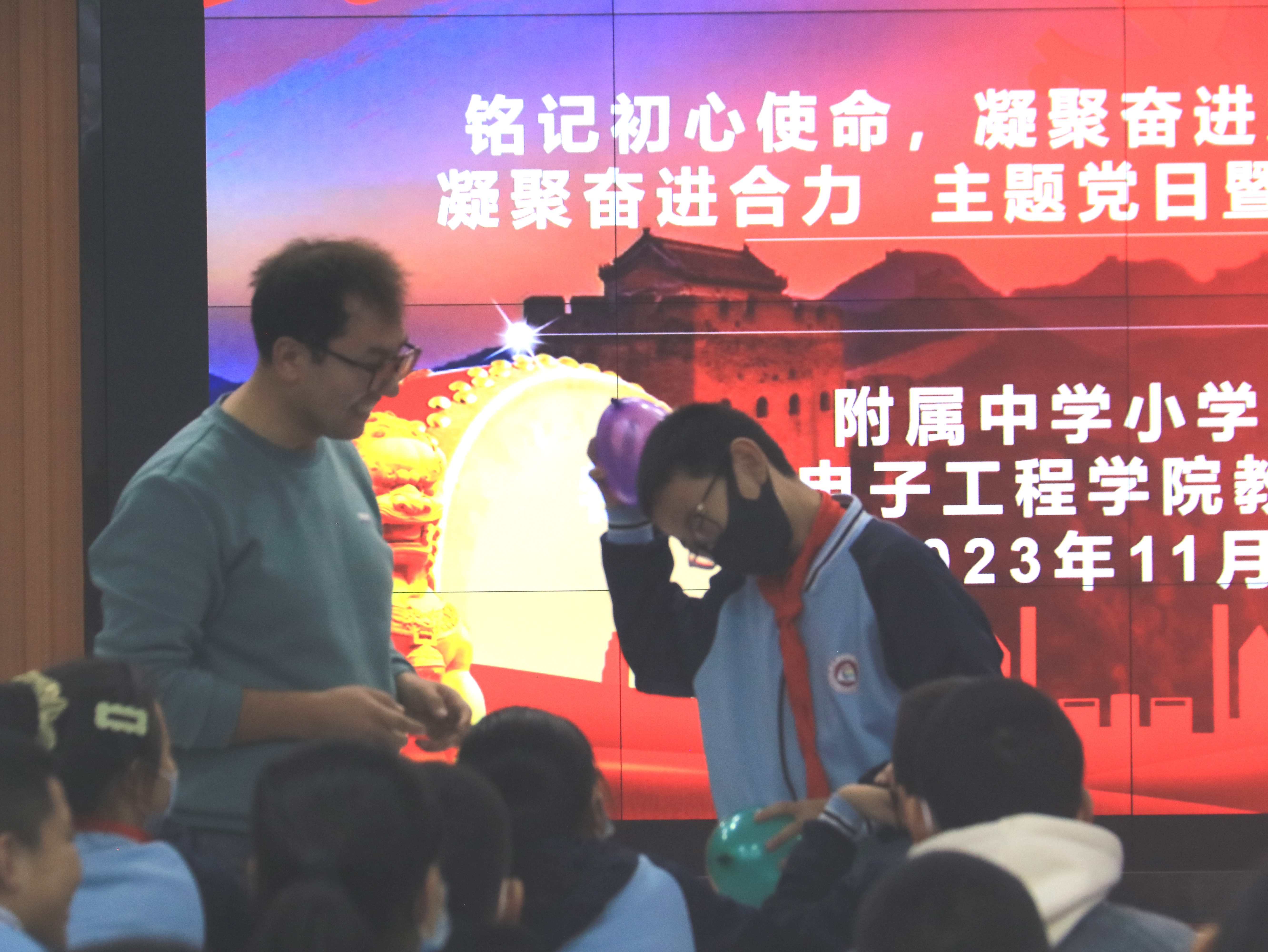 最后,教师第一党支部党员教师与六年级的孩子们共同完成了一系列生动有趣的科学小实验。学院实验中心主任邹艳波老师为孩子们演示“看不见的力”实验,并讲解其蕴含的物理原理。麦麦提依明老师和孩子们分享神奇摩擦起电实验,孩子兴高采烈,饶有兴趣的积极参与。学院还为每个孩子赠送科学实验套盒,鼓励孩子们能通过自己的巧手来完成属于自己的作品。