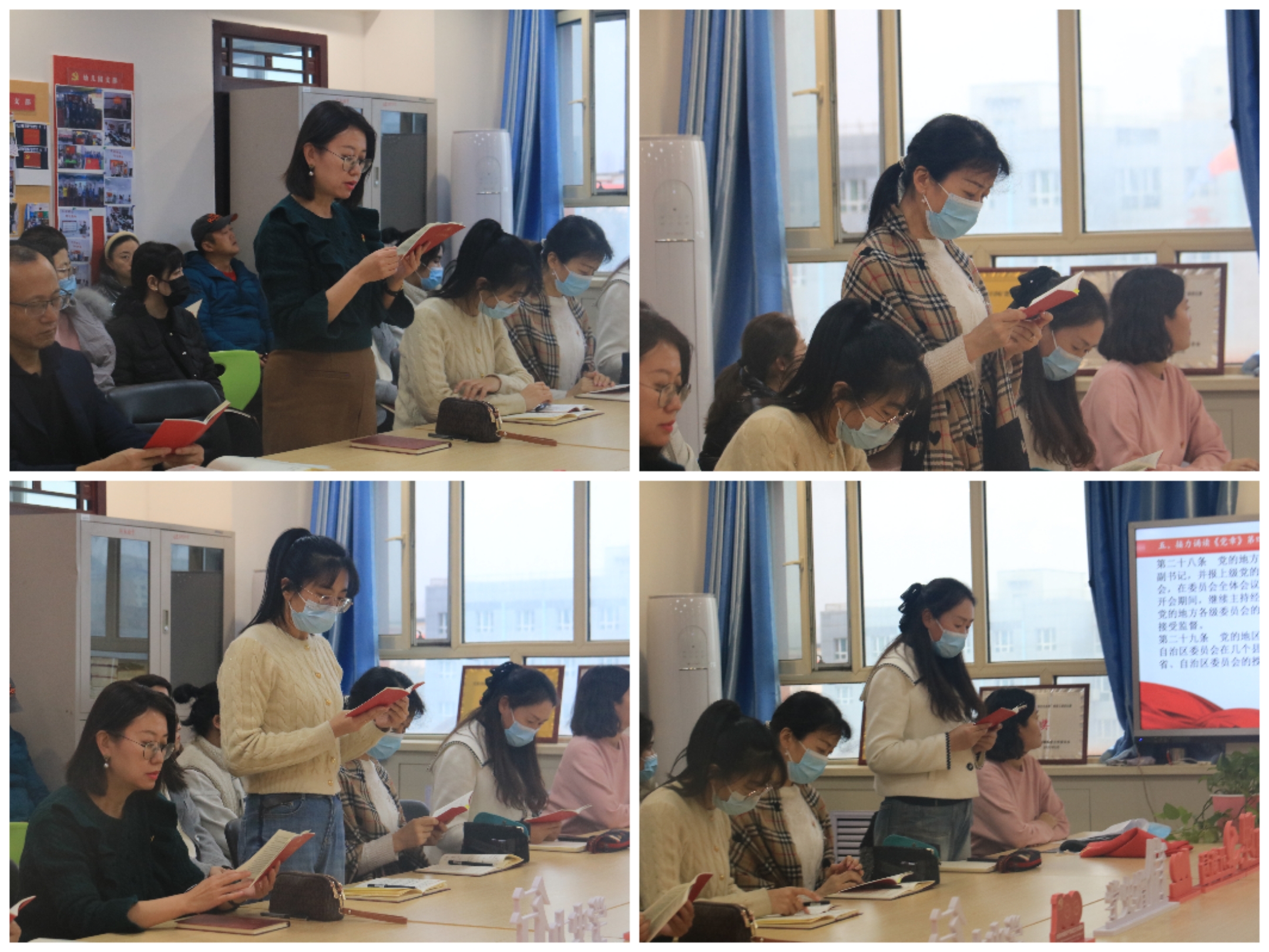 随后,向梅院长和小学德育主任靳锋老师在活动中分别致词。全体党员同志一起学习了《中国共产党党徽党旗条例》,进一步提高对党徽党旗政治功能的认识,规范党旗党徽的使用。今年会附中小学党支部的老师们接力诵读了《中国共产党章程》第四章—党的地方组织内容。