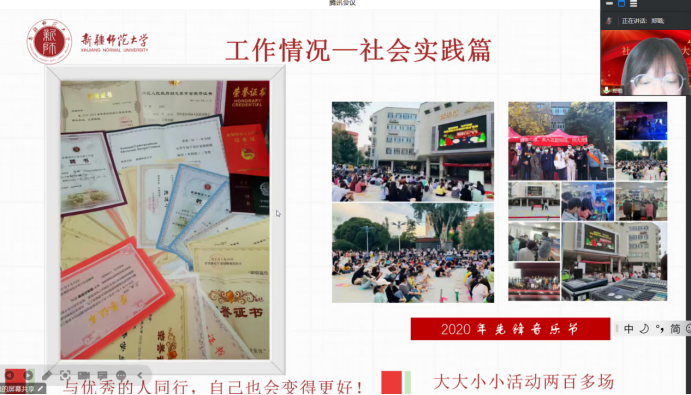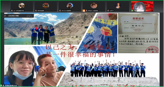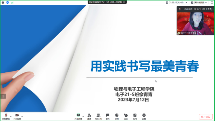 活动由今年会分团委副书记赵燕燕主持,物理学20-4班石兆宇、电子信息科学与技术19-6班郑璐、电子信息科学与技术21-5班佘青青等三位同学结合自身社会实践经历,分别从参加红色教育实践课堂的学习体会、参加社会实践活动和志愿服务活动的成长与收获、参加社会实践的感悟和体会等方面详细进行汇报和分享。