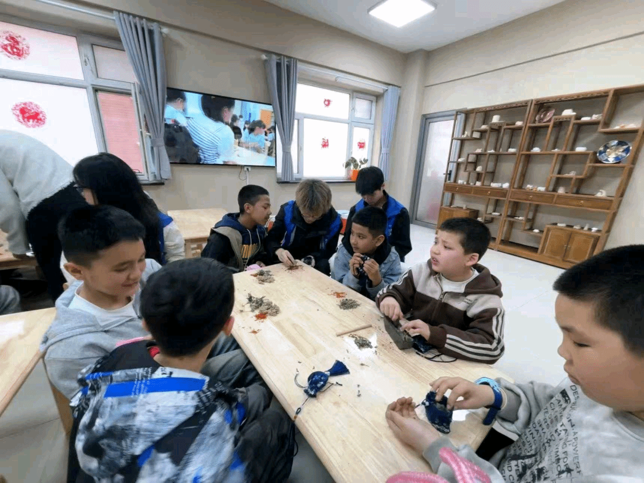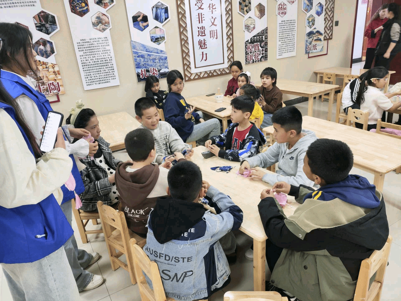 在非遗手工体验区,今年会志愿者化身“传统文化助教”,与社区孩子们互动。在老师的指导下,共同学习,从剪纸技艺的细腻讲解到泥塑造型的创意引导,志愿者们将课堂所学转化为生动实践,用通俗易懂的语言向孩子们讲述非遗历史,手把手指导制作技巧。看到孩子们从生疏到熟练,最后捧着自己作品欢呼时,大家感受到文化传承的薪火正在传递。对于志愿者们而言,这次活动同样意义非凡。他们在活动过程中收获了许多宝贵的感受与心得体会,亲身感受到了社区内团结友爱的良好氛围。