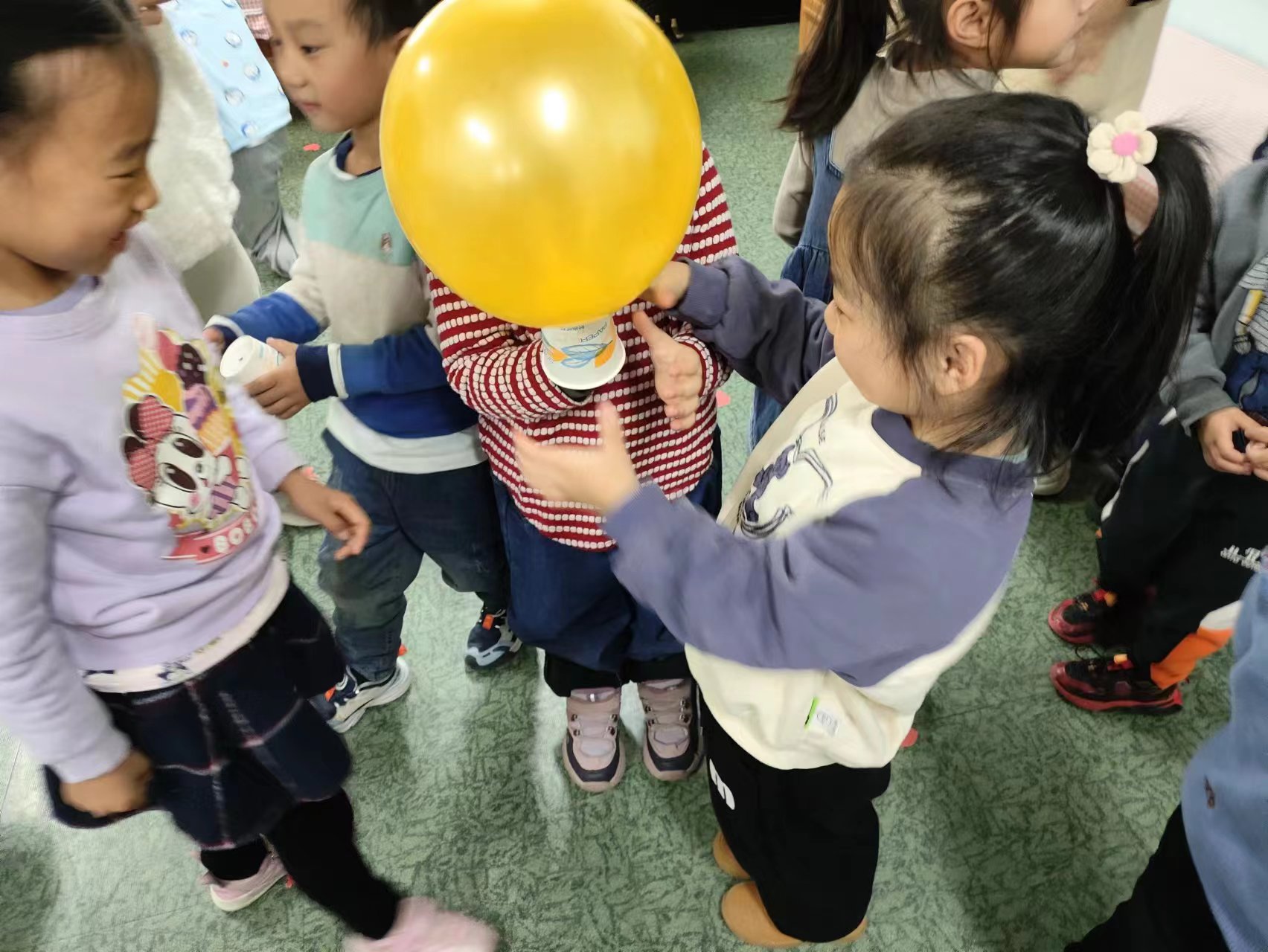 孩子们在展示自己制作的不倒翁