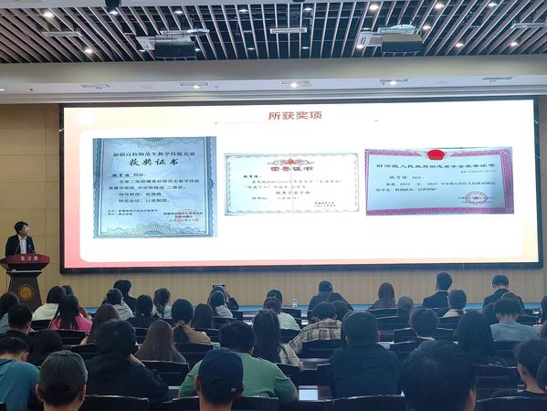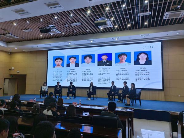 会议邀请了2024届毕业生中已就业和升学的6名学长学姐进行分享。签约中国民航新疆空管局的电子信息科学与技术20-5班刘乐建议大家首先要明确自己的目标,之后可以多咨询学长学姐,利用好身边的资源,要敢于尝试不要害怕失败。考取“硕师计划”的物理学20-1班魏育慷介绍了推免条件以及自身的经历,并强调大家一定要明确目标,努力去向它靠近,克服困难,勇敢拼搏。考取山东大学硕士研究生的物理学20-4班翟西洋讲述了自己的考研经历和大学四年获取奖学金的学习经验,并分享了自己在备考时的方法和技巧。考取和田地区选调生的物理学20-1班伊卜拉伊木江·依马木山介绍了报考选调生所需条件和相关注意事项,并向大家分享了自己考选调生的经历和经验。签约库尔勒华山中学的物理学20-4班闫诗卓强调了简历准备的重要性,并建议大家要多关注相关招聘信息并做好充分的试讲准备。考取今年会官方网站硕士研究生的物理学20-1班窦凤怡分享了自己的考研复习准备和考取本校的优势,并针对考研的科目展开了详细的备考讲解。互动答疑环节,在场的同学们根据自己的实际情况和求职意愿踊跃发出提问,学长学姐分别就问题认真回答,鼓励同学们要敢于挑战自己,积极面对未来道路上的困难。