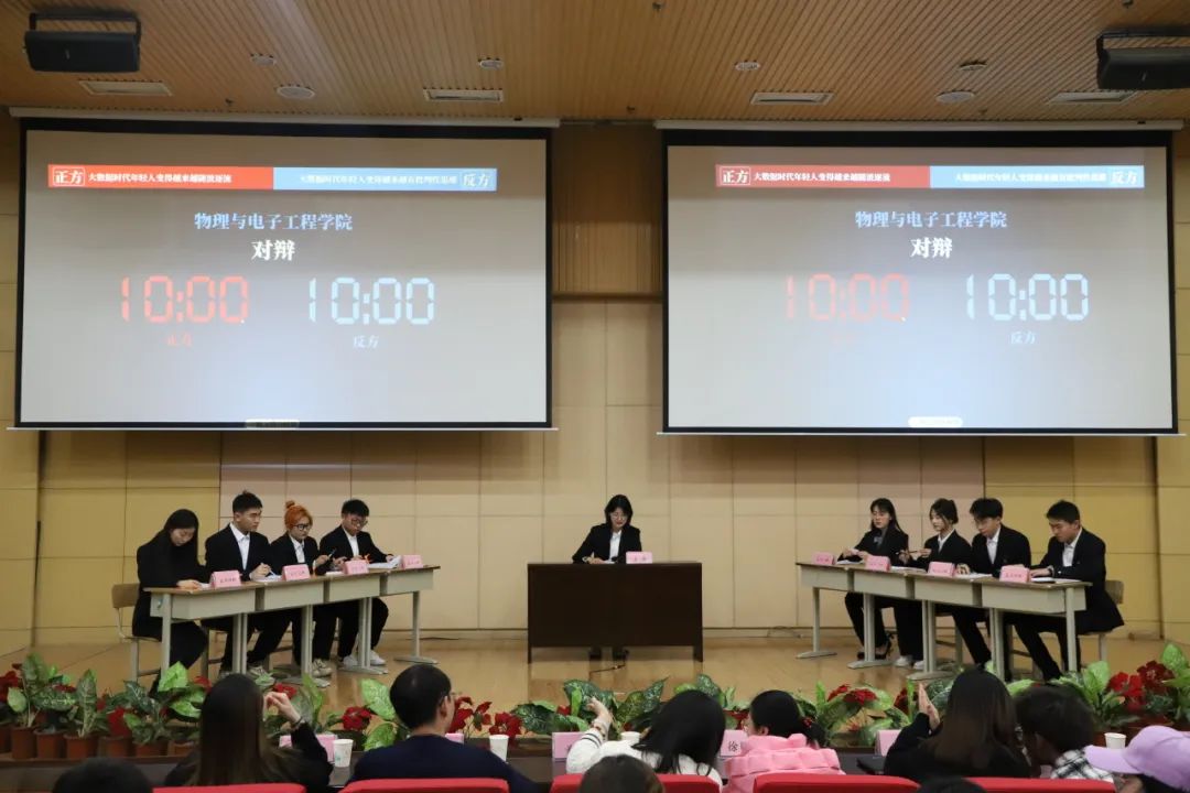 四组选手分别就“成熟是/不是我们必须追寻的价值”“大数据时代年轻人变得越来越随波逐流/有批判性思维”“灾难中的自私应该/不该被谴责”“人懂得坚持/退让更伟大”这四个辩题展开激烈的辩论。正方观点明确,证据充足,条理清晰 ,字字珠玑,使现场气氛迅速升,反方辩手们积极发言,思路清晰,论辩精准有力、掷地有声。双方辩手配合默契,围绕辩题旁征博引,精彩万分,并针对对方的漏洞进行反驳,在唇枪舌战的交锋之中展现出辩手优秀的逻辑思维能力。