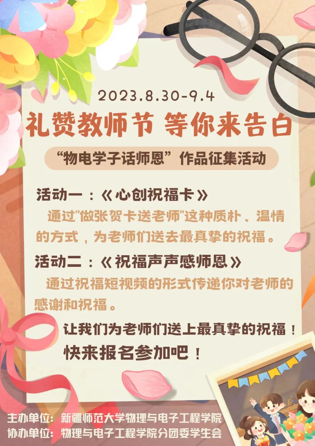 厚谊常存魂梦里,深恩永志我心中,漫漫人生路当中,我们总会遇到对自己有意义的老师。教师,是一个神圣的职业,那三尺讲台上,绽放的是一个老师对学生殷切的期望和无私的奉献,“春蚕到死丝方尽,蜡炬成灰泪始干”您燃烧着自己,却照亮了我们,多少年过去,流逝的是时光,难忘的却是老师,是那些曾经刻在心上的谆谆教诲和切切关怀。在第39个教师节来临之际,今年会jinnianhui开展“礼赞教师节、等你来告白”—“物电学子话师恩”作品征集活动,欢迎同学们为我们和蔼可亲的老师们送上最真挚的祝福!