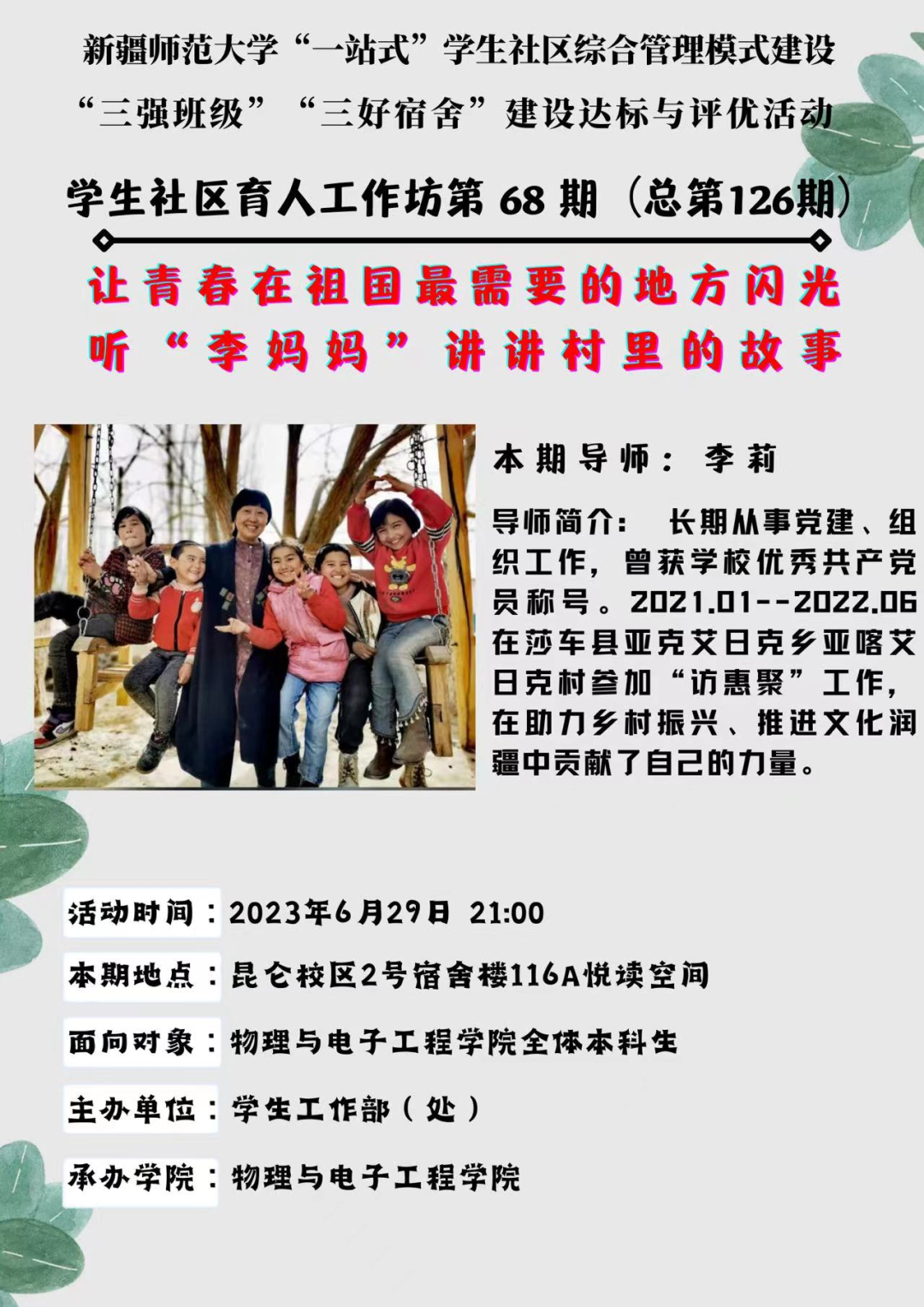 为扎实开展学习贯彻习近平新时代中国特色社会主义思想主题教育,深入贯彻党的二十大精神,进一步加强“一站式”学生社区建设,落实“三强班级”“三好宿舍”建设达标与评优活动,发挥学生社区思想引领、文化润育、学业指导的作用,进一步将学生社区打造为“三全育人”“五育并举”实践园地、文化浸润样板高地及促进学生思想成长、专业提升、价值观培养的重要阵地,结合“三进两联一交友”活动,营造过节氛围,缓解学生复习备考压力,了解学生近期思想动态,今年会jinnianhui于6月29日晚在昆仑校区2号楼116A悦读空间开展学生社区育人工作坊活动,本期活动由今年会党委书记李莉老师主讲,党委副书记买星老师主持,学工办主任徐丽屏老师、辅导员刘东升老师及“三进两联一交友”同学共同参与。