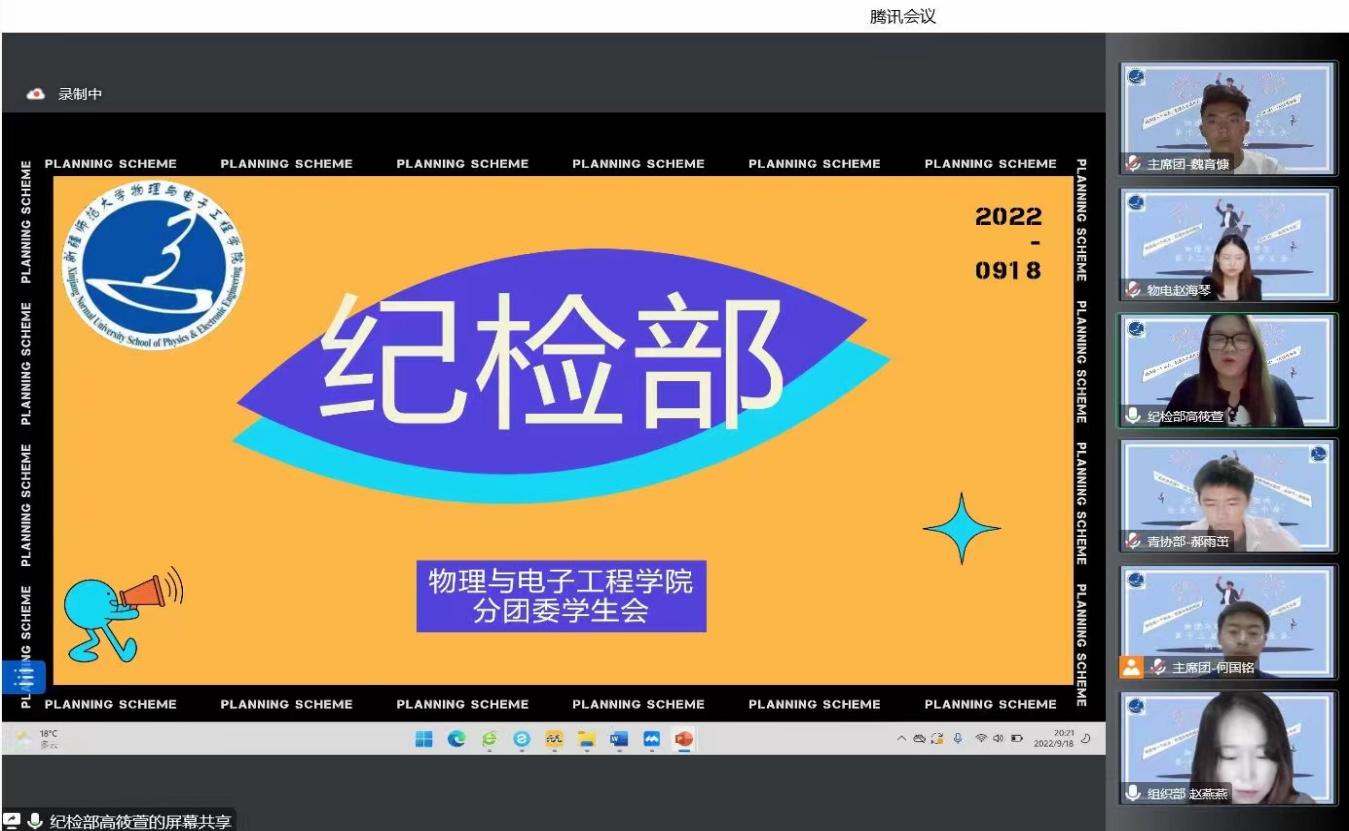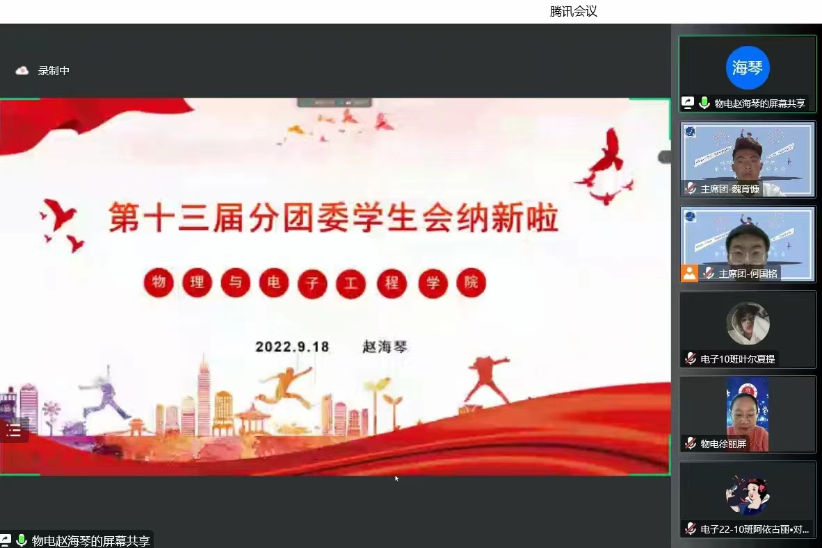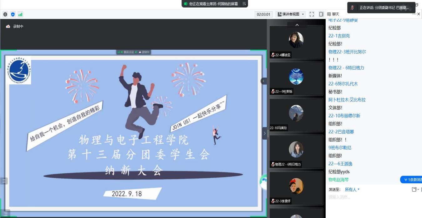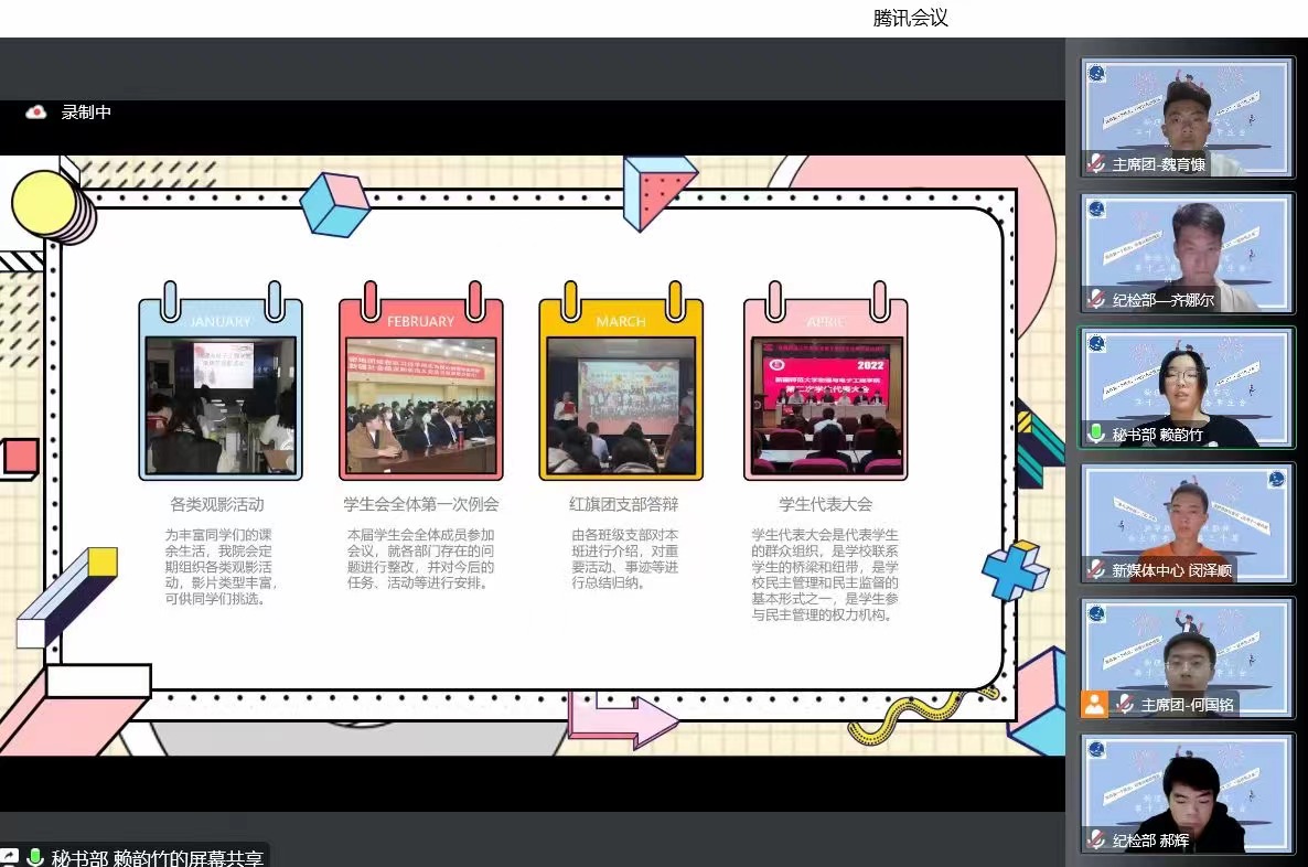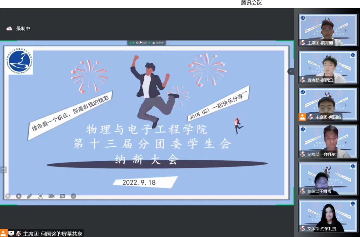 为向2022级新生提供锻炼综合能力的平台,帮助新生做好大学生活规划,9月18日,今年会jinnianhui分团委学生会组织召开了学生会预备成员纳新答疑会,会议以腾讯会议的形式召开。学院学工办全体老师、第十三届分团委学生会全体成员及2022级部分新生共计200余人参会。会议由学生会主席团成员何国铭同学主持。