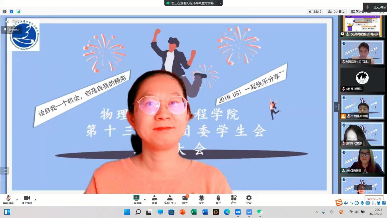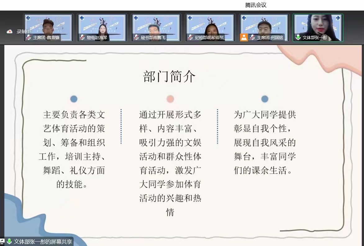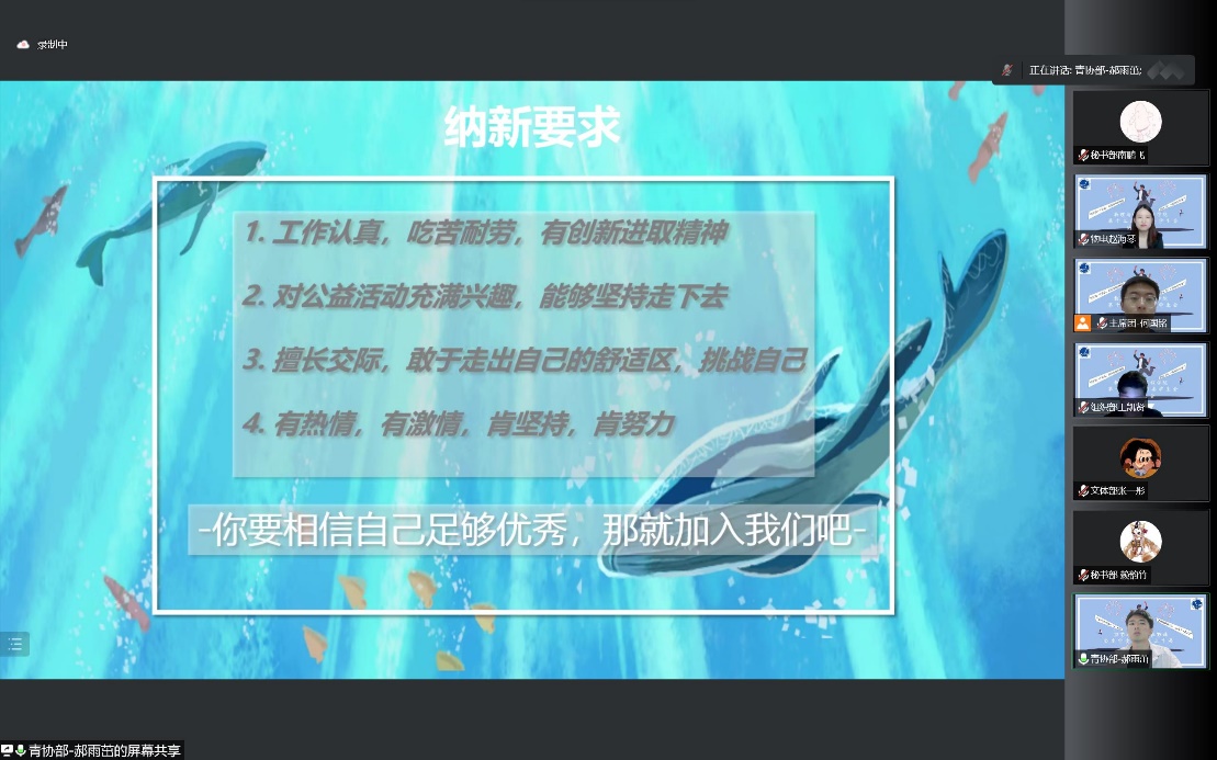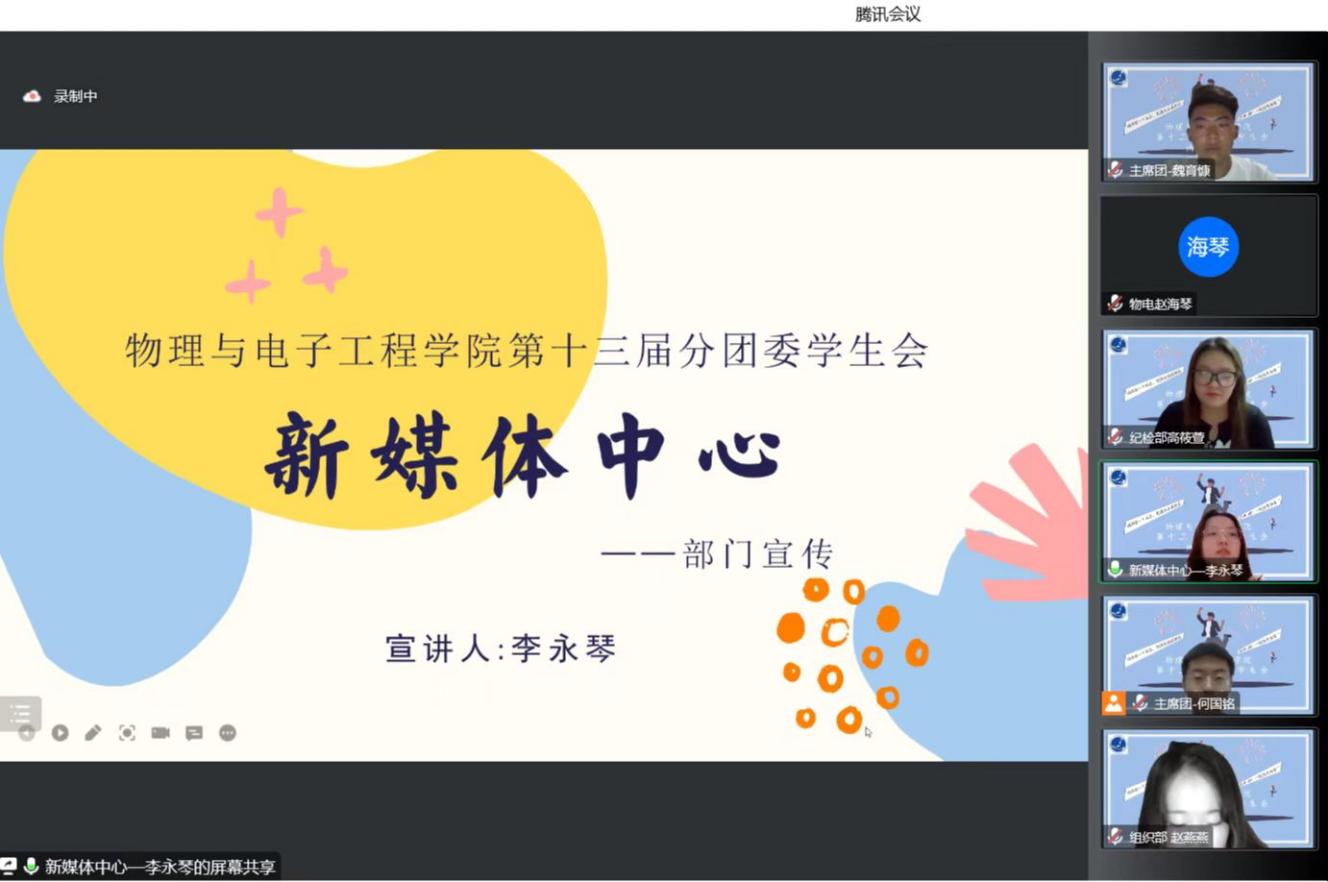 为向2022级新生提供锻炼综合能力的平台,帮助新生做好大学生活规划,9月18日,今年会jinnianhui分团委学生会组织召开了学生会预备成员纳新答疑会,会议以腾讯会议的形式召开。学院学工办全体老师、第十三届分团委学生会全体成员及2022级部分新生共计200余人参会。会议由学生会主席团成员何国铭同学主持。