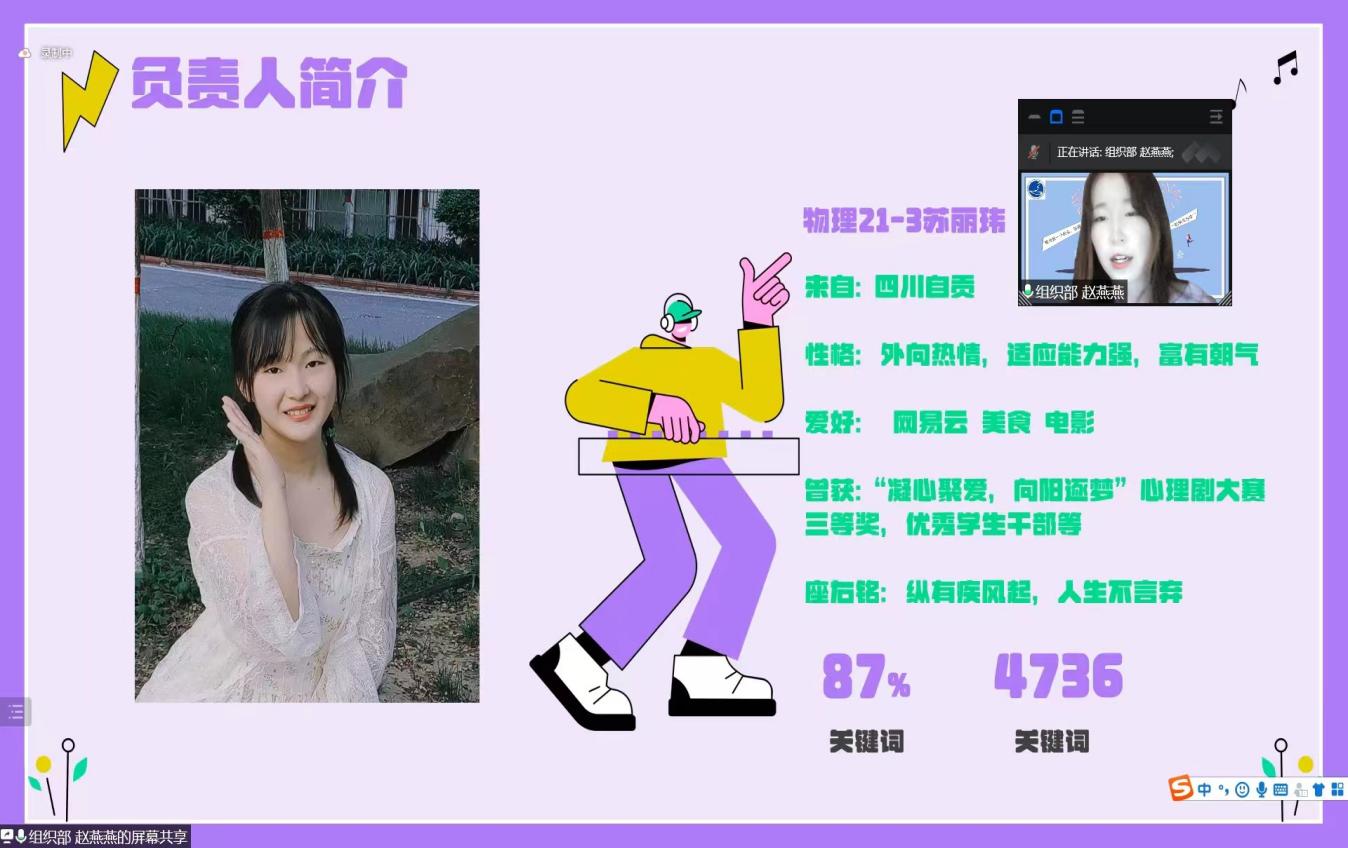 学工办主任徐丽屏为会议致辞,她希望同学们在学院分团委学生会这一广阔平台上发挥智慧、增长才干、实现梦想,成长为有责任、有担任、有能力的优秀青年。辅导员赵海琴从组织架构、部门介绍和各类特色活动等方面对分团委学生会进行了介绍,并勉励新生积极加入学生会,为学生会注入新力量。学生会各部门负责人围绕部门简介、负责人简介、活动展示、纳新要求四个方面,以PPT展示的形式详细而生动地进行了介绍。学生会第十三届主席团成员结合自身成长历程,鼓励新生积极锻炼自己,在大学四年里不断充实自己的课外生活,积累经验、磨练技能、绽放魅力。