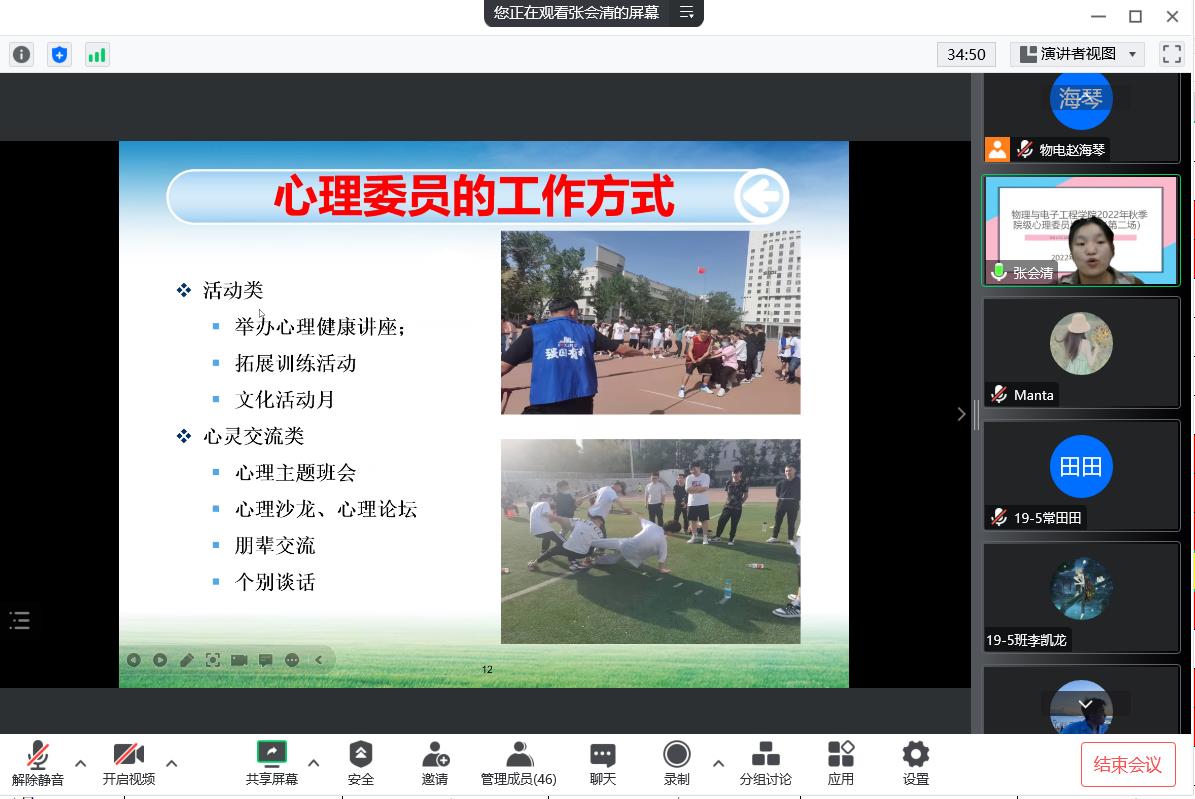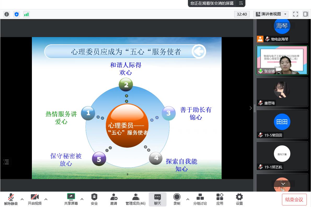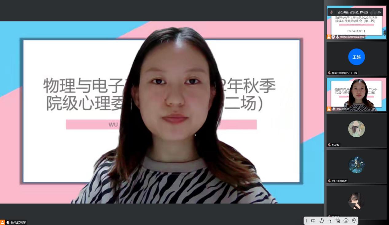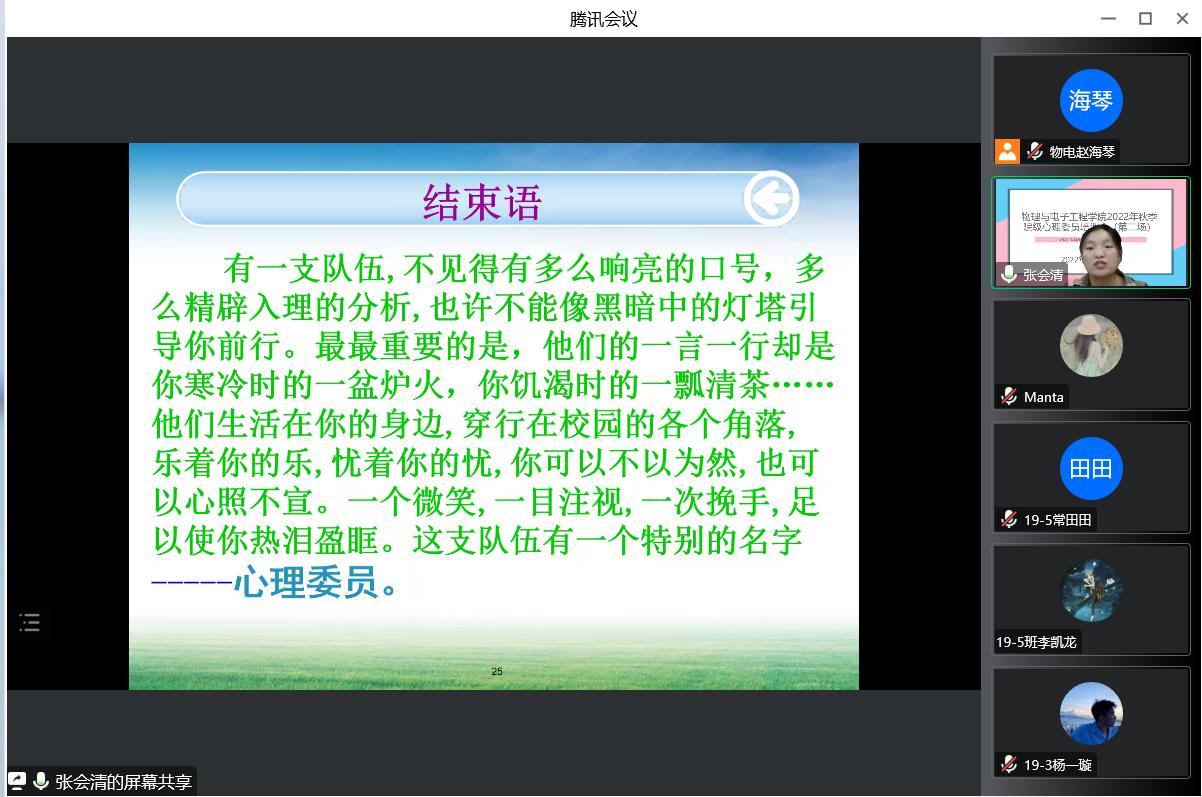 班级心理委员是学校心理健康教育工作的重要组成部分,在我校心理健康教育工作中发挥着重要作用。为进一步提升今年会心理委员在心理健康教育工作中的积极影响,今年会于11月10日晚20:00在腾讯会议线上开展了第二场2022年秋季院级心理委员培训会。本次培训邀请到了今年会物理20-3班张会清(原学生会心悦部负责人)作为主讲人做培训,学院全体心理委员参加。