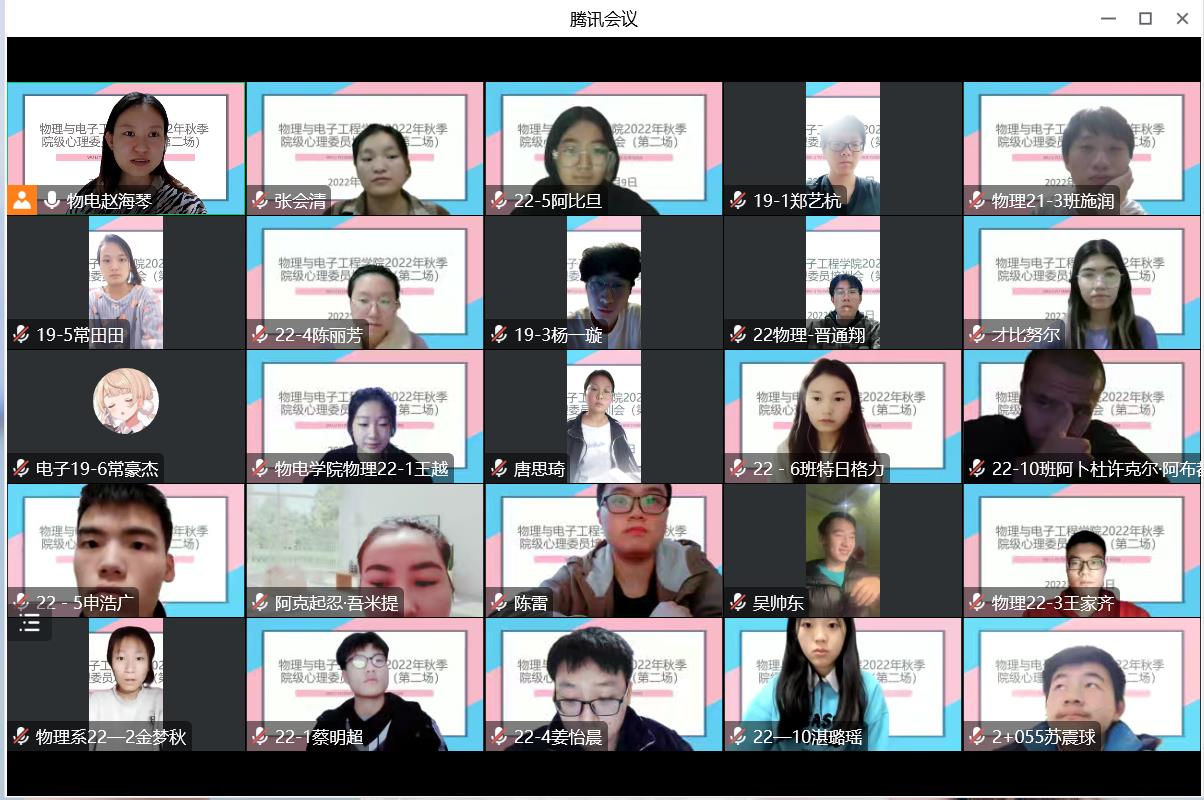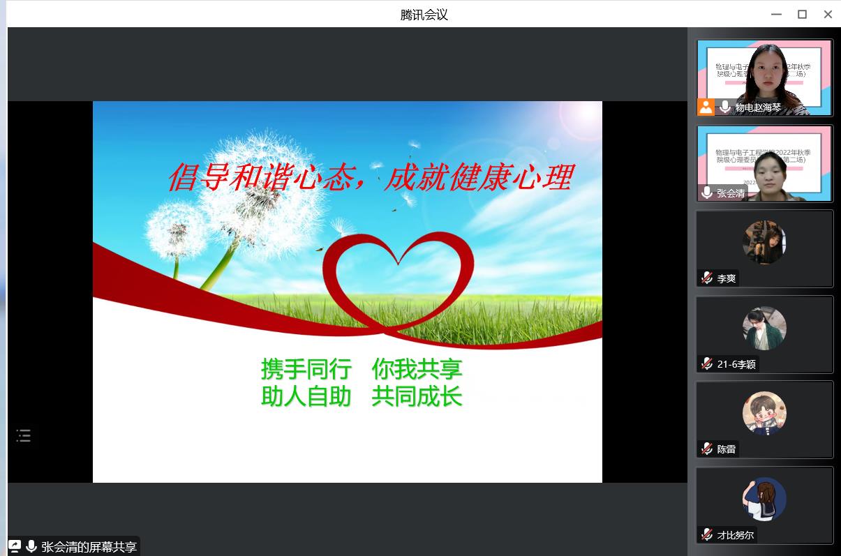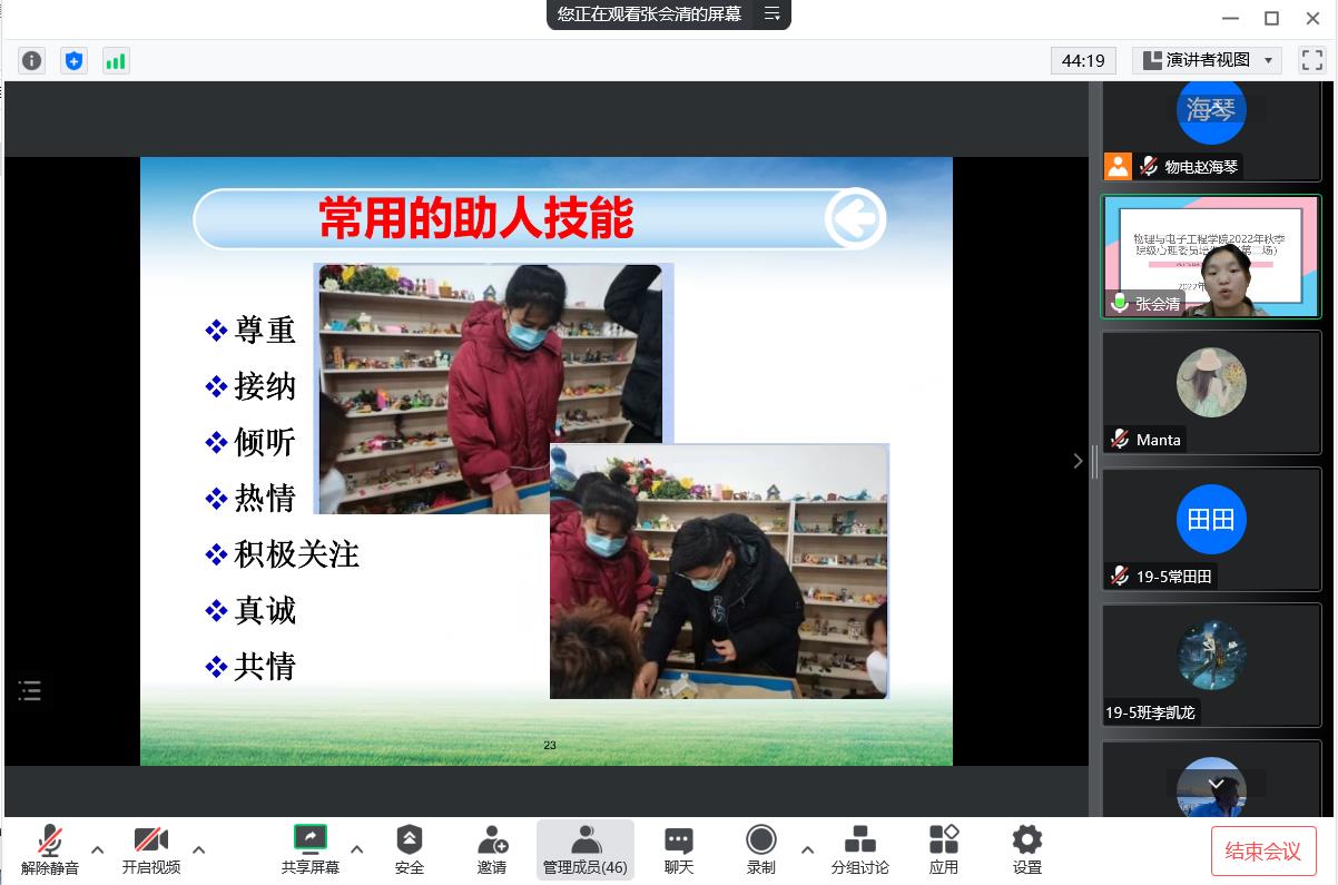 班级心理委员是学校心理健康教育工作的重要组成部分,在我校心理健康教育工作中发挥着重要作用。为进一步提升今年会心理委员在心理健康教育工作中的积极影响,今年会于11月10日晚20:00在腾讯会议线上开展了第二场2022年秋季院级心理委员培训会。本次培训邀请到了今年会物理20-3班张会清(原学生会心悦部负责人)作为主讲人做培训,学院全体心理委员参加。