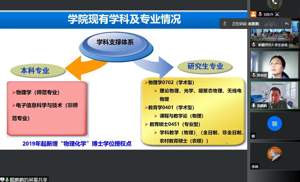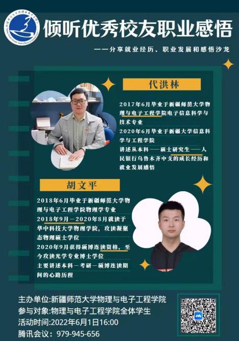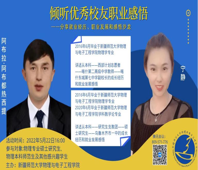目前学院已邀请2002届毕业生、自治区教学能手、物电学院院长路俊哲,2011届毕业生、内蒙古大学物理科学与技术学院教授刘志峰,2006届毕业生、西安科技大学通信与信息工程学院副教授黄晓俊,2006届毕业生、自治区物理特级教师丁占军,2006届毕业生、中国联通新疆分公司网络部高级主管赵世山等优秀校友,分别结合专业特色、学科发展、以及求学经历和就业经历,向学弟学妹们倾情分享。邀请原物理学12-3班阿布拉·阿不都热西提(现任喀什市东城第七初级中学德育副校长)、2017级课程与教学论研究生宁静(现任乌鲁木齐市一中教师)、电子信息科学与技术13-4班代洪林(目前就职于人民银行乌鲁木齐中心支行)、物理学14-1班胡文平(华中科技大学在读博士)做回访交流,讲述成长经历以及就业发展感悟。