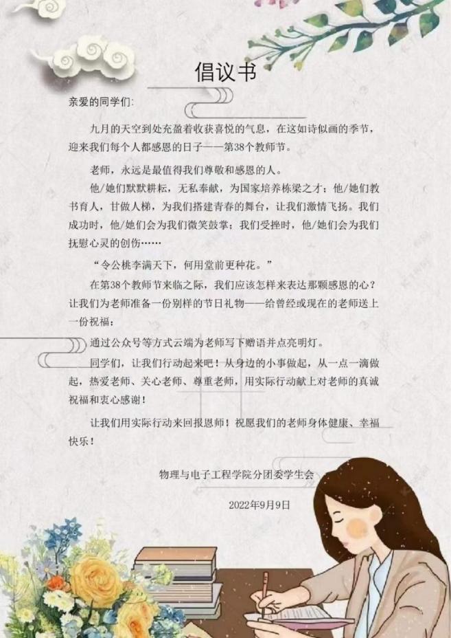 2022年9月10日是第38个教师节,在教师节来临之际,为营造“感恩师,敬师道”的校园文化氛围,今年会jinnianhui分团委学生会于2022年9月4日至9月10日组织全院学生开展了“感念恩师·为教师亮灯”活动。