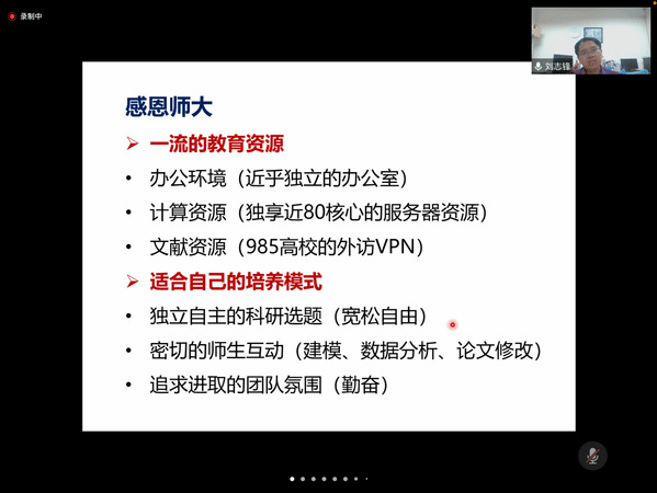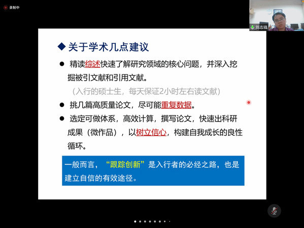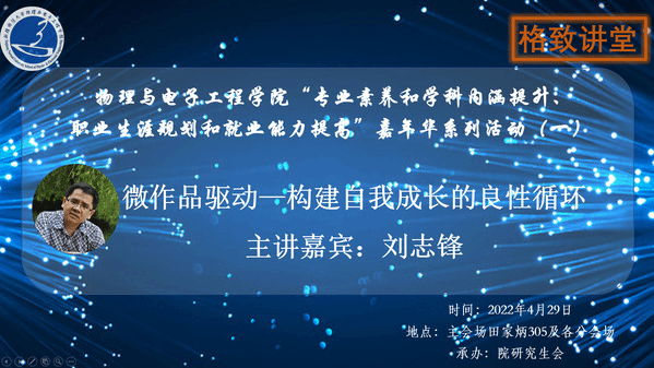 为提升学科内涵建设,加强学生专业素养养成,坚定学生的科研信心,同时鼓励本硕学生做好职业生涯规划,激发同学们的学习热情,助力同学们卓越成长。今年会jinnianhui于2022年4月29日晚20:00特邀内蒙古大学物理科学与技术学院教授,研究生导师刘志锋教授回访母校交流,带来主题为“微作品驱动-构建自我成长的良性循环”线上精彩讲座,学院老师、全体研究生和本科生积极参加,本次活动由院研究生会承办,副院长戴鹏鹏主持。