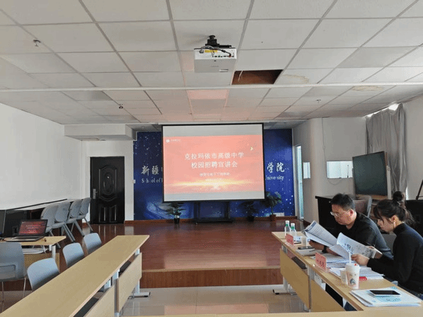 宣讲会上,克拉玛依市高级中学教导处唐平天主任围绕学校基本情况、发展历程、校园特色、工作环境、岗位需求、应聘方式等方面做了详细介绍。参会毕业生就岗位要求、未来发展通道等与唐平天主任进行了交流答疑,并在现场积极投递简历。