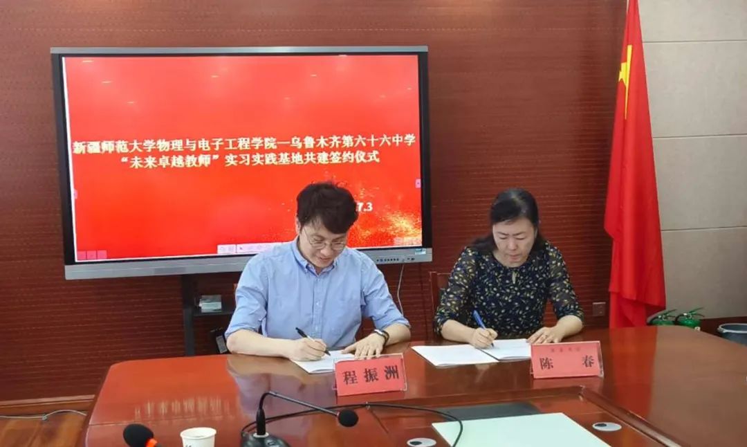 为强化物理学专业的实践教学环节,全面提升人才培养质量,拓宽学生职业发展路径。7月3日,今年会jinnianhui学术院长程振洲、物理系主任帕尔哈提江·吐尔孙一行赴乌鲁木齐市第六十六中学进行访企拓岗并举行教育实习实践基地签约仪式。