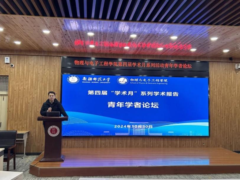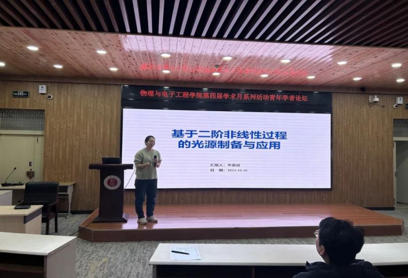 论坛上,学院新入职博士牛素俭、杨楠、马淼淼三位教师分别分享了自己的研究成果。牛素俭作了题为“基于二阶非线性过程的光源制备与应用”的报告,简要阐述了非线性光学效应的基本原理,基于二阶非线性过程的频率转换,提出了一种制备多色激光器的方法,基于三阶准相位匹配倍频实现了高效率的蓝光输出;通过频率上转换,实现了HOM干涉。