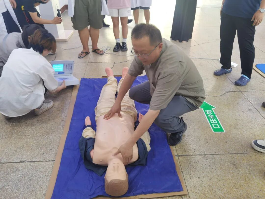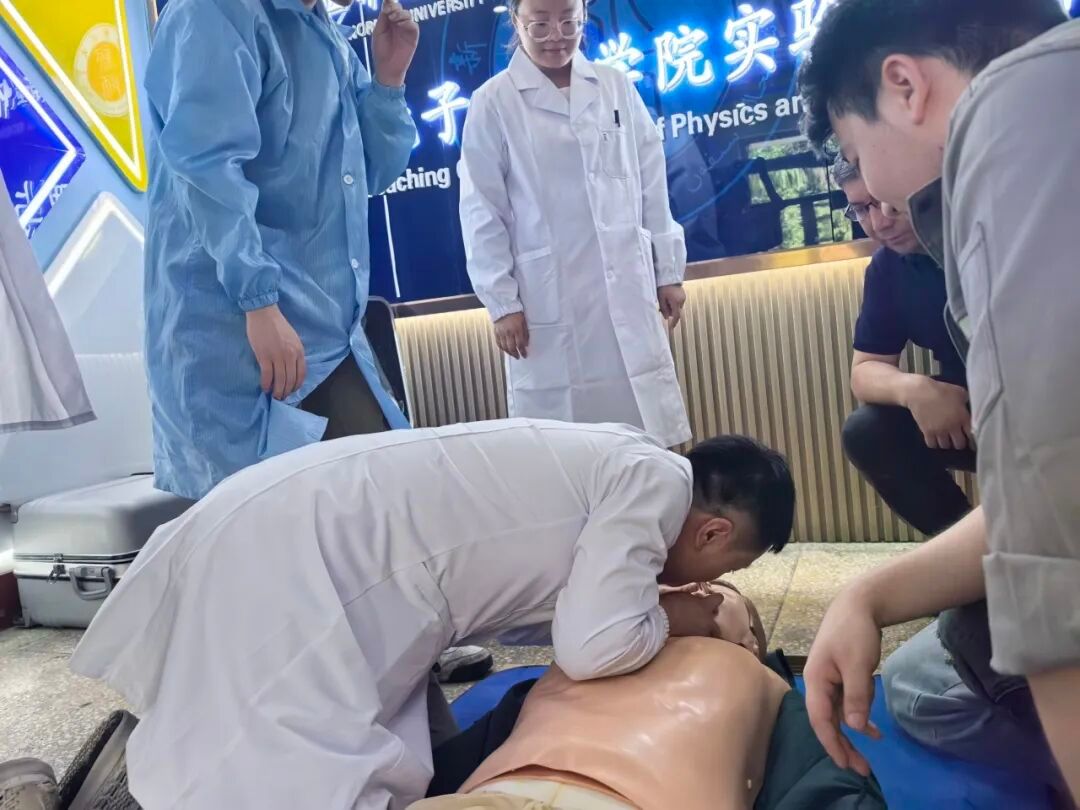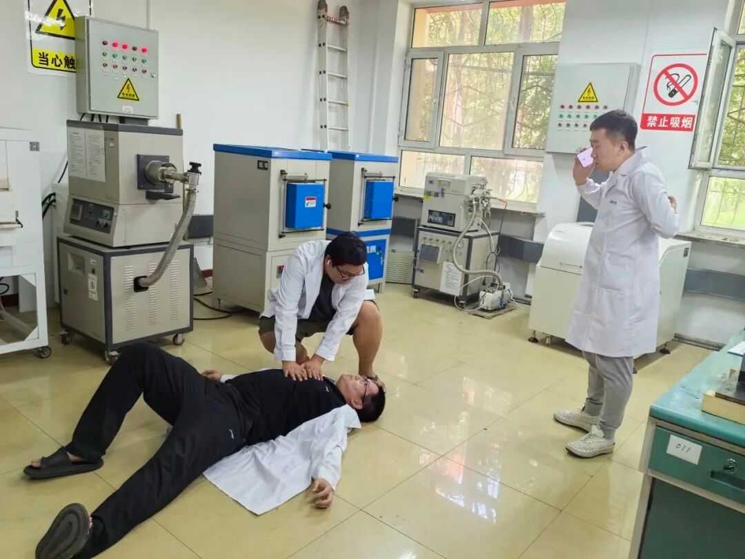 演练场景为实验室在进行高温设备操作时,因设备老化导致绝缘失效,实验人员不慎触电,身体被电弧灼伤并失去意识。现场人员首先进行自救,在确保自身安全的前提下,尝试对触电者进行初步救助,避免情况进一步恶化。同时,迅速切断电源,防止电流继续对触电者造成伤害,并避免事故扩大危及更多人员安全。随后,安排人员拨打报警电话,清晰准确地向相关部门报告事故地点、事故情况等信息。体育学院苑建齐老师第一时间赶到现场,凭借专业的急救知识和丰富的实践经验,对触电者展开急救。在急救过程中,苑老师进行现场教学,详细讲解人员发生触电、溺水情况时的急救措施,包括心肺复苏的操作步骤、按压频率、按压深度以及人工呼吸的方法等关键要点。在苑老师讲解和示范后,其他同学依次进行急救演练。苑老师在一旁耐心指导,及时纠正同学们在操作过程中出现的问题,如按压位置不准确、按压力度不够等。通过实际操作,同学们进一步熟悉了急救流程和操作技巧,提高了应对突发情况的能力。